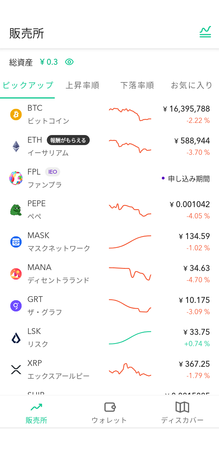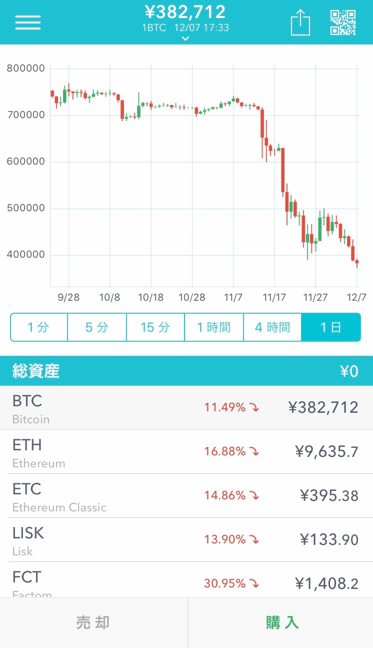 アプリを開くと最初に表示されるのがこの画面です。各通貨の現在の価格と24時間前の価格との比較が一覧で並びます。総資産額が一目でわかるので、日々の値動きを簡単にチェックできます。まぁ、私は最近とある事情で出金しちゃったのですが・・・